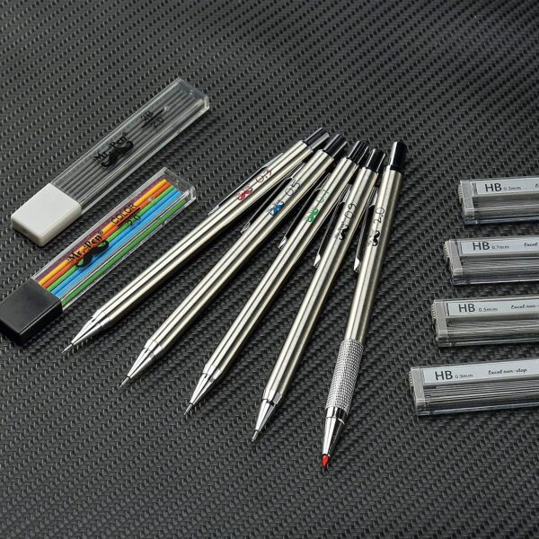 This mechanical pencil set is a great choice for those who need a quality pencil for general or technical writing. The set includes five pencils in five different sizes (0.3, 0.5, 0.7, 0.9 and 2.0 mm), as well as a set of five HB lead refills and ten eraser refills. The minimalist all-metal design gives the pencil a professional look and feel, while the comfortable grip makes it easy to hold and use for extended periods of time. The set of five different sizes is ideal for everyday use, as well as for art and technical drawing. Whether you’re looking for a reliable writing tool for school or work, or you need a versatile set of pencils for your creative endeavors, this mechanical pencil set is a great option.