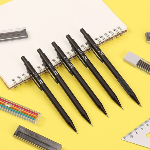 - Mr. Pen black metal mechanical pencil set includes 5 quality pencils in 5 sizes: 0.3, 0.5, 0.7, 0.9, and 2.0 mm; a set of 5 HB lead refills of each size, 1 tube of 2.0mm colored lead refills, and 10 eraser refills. Each pencil has a comfortable grip for hours of writing comfort!