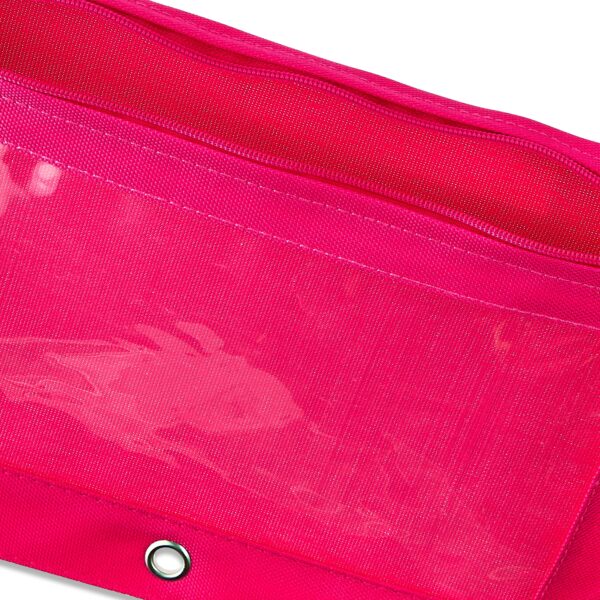 It has three reinforced grommets for long life. It’s plenty big enough to hold all the pens, pencils, markers, highlighters, glue sticks, small hand sanitizer gel bottles, compasses, protractors, calculators, and whatever else your class schedule requires this semester. The large see-through window on the front of the pouch allows you to see what’s inside. It’s perfect for keeping all your school gear organized and right where you need them when you need them.