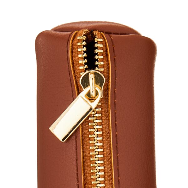- Simulated leather pouch in a stunning cognac brown color with gold accents