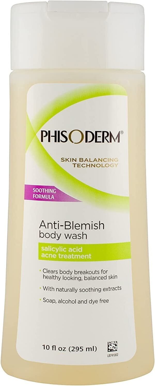 Phisoderm Anti-Blemish Body Wash 10 Oz (295 Ml – Soothing acne-fighting formula treats and helps prevent body breakouts while it washes away dirt and oil This medicated, gel body wash treats and helps prevent acne blemishes on the body and face. It rinses easily and leaves no residue or tightness. Designed with Skin Balancing Technology, pHisoderm Anti-Blemish Body Wash gently cleanses and calms, without disrupting the skin’s natural protective balance. With 2% salicylic acid acne medicine plus skin-soothing Vitamin E, Aloe, and Chamomile, and a fresh revitalizing fragrance for clean and clear skin all over. Fight acne while you shower with pHisodermR Anti-Blemish Body Wash. Formulated for oily and acne-prone skin, this soothing body wash for acne is pH-balanced with Skin Balancing Technology to cleanse dirt and oil without disrupting your skin’s natural protective balance. Skin-soothing vitamin E, aloe, and chamomile, and a fresh revitalizing fragrance, create a pampering experience. This anti-acne body wash contains 2% salicylic acid acne treatment to clear up acne-prone skin.