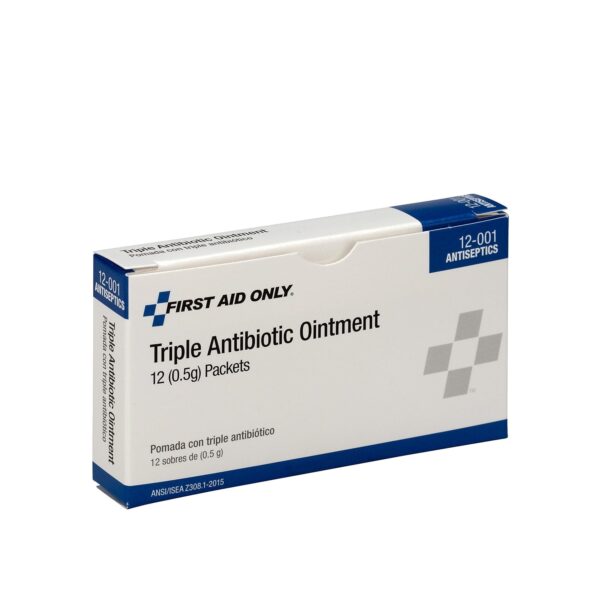 Triple Antibiotic Ointment packets with 12 per box. The triple antibiotic ointment helps prevent infection in minor cuts, scrapes and burns. It provides three-in-one strength first-aid antibiotic properties and promotes fast healing. Individual single use packets are easy and convenient to use. The box of antibiotic ointment is ideal for a first aid kit or as a stand alone supply.