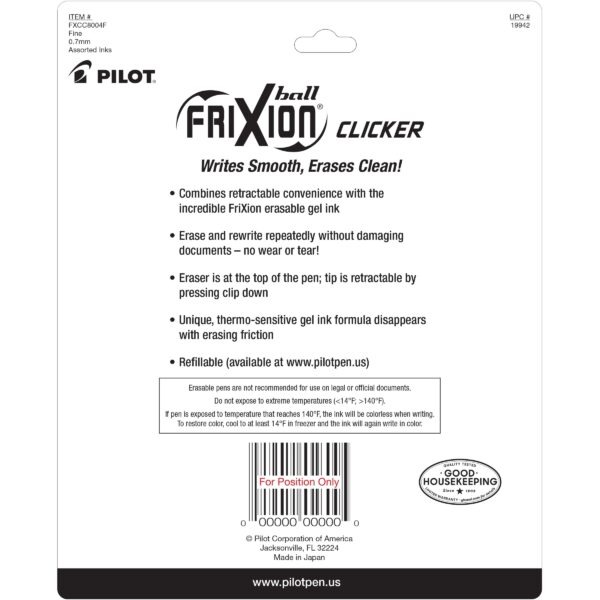 The Pilot FriXion Clicker erasable gel pen lets you write, erase and re-write until your work is perfect, without damaging your documents. Thanks to the thermo-sensitive gel ink that disappears completely with friction, you can erase mistakes easily for efficient writing. The included eraser at the top won’t wear down or leave messy eraser shavings or residue. Point size: 0.7 mm; Point Type: Fine; Ink Color(s): Assorted; Pen Type: Erasable Gel; 8 count