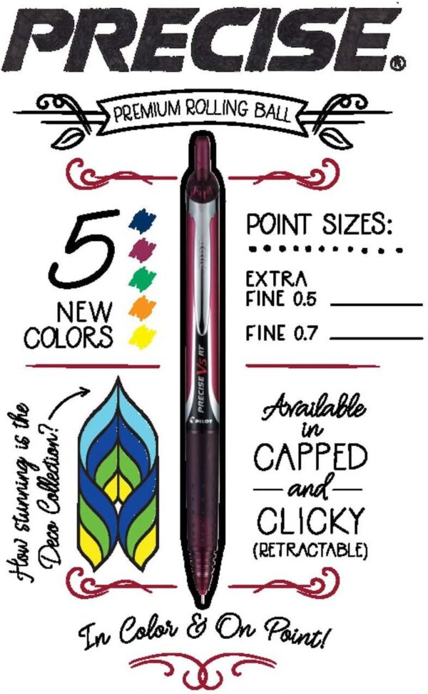 Pilot, Precise V5 RT Refillable & Retractable Liquid Ink Rolling Ball Pens, Extra Fine Point (0.5 mm) Assorted Ink Colors, Pack of 7 PILOT precise V5 retractable Premium rolling ball pens, extra fine point, assorted colors, 7-Pack (26095). – Smooth Writing Liquid Ink: Glides effortlessly across the paper, offering consistent strokes and skip-free writing; Made with a durable tungsten carbide extra fine tip – Patented Precise Point Technology: Pilot’s Precise pens feature a precision tip that delivers clean and accurate lines every time, making your writing or creativity come to life with remarkable detail – Versatile: Perfect for taking notes & jotting down grocery lists; Writes smooth for a polished, writing, drawing, designing, sketching or doodling experience – Superior Comfort & Control: The soft rubber grip offers a comfortable writing experience while providing excellent control – Power to the Pen: Express yourself effortlessly with Pilot’s line of innovative writing tools, including gel ink, erasable, rolling ball, ballpoint and fountain pens & dry erase markers & more – – – 0.352 ounces 0.56 x 4.5 x 7.25 inches