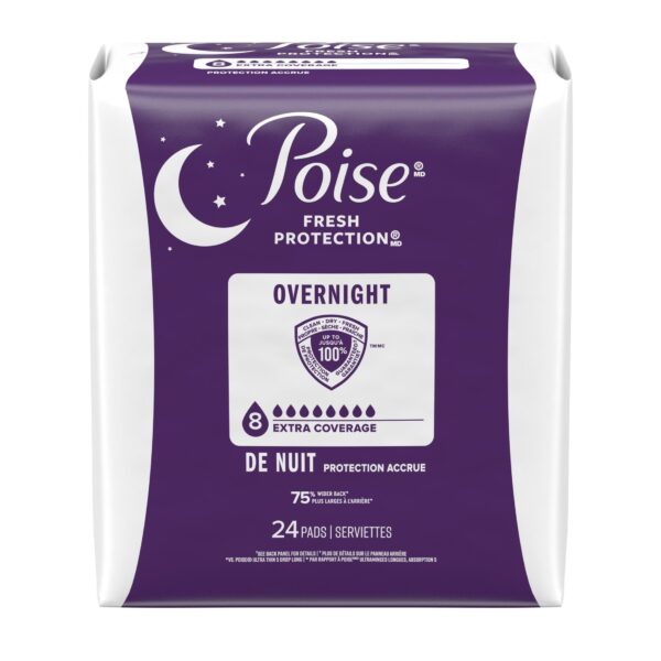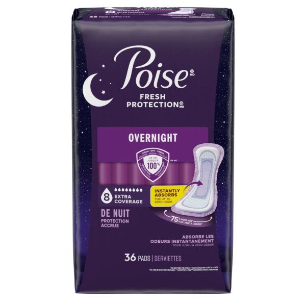 - POISE OVERNIGHT INCONTINENCE PADS: 72 incontinence and postpartum bladder leak pads, 8 Drop Extra Coverage (72 pads total)