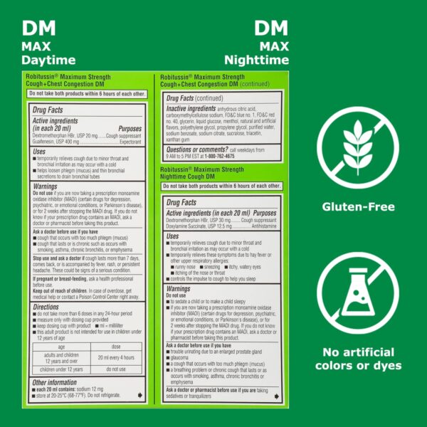 Robitussin Maximum Strength Cough + Chest Congestion DM and Maximum Strength Nighttime Cough Dm, Cough Medicine, Berry Flavor – 4 Fl Oz Bottles (Pack of 2)