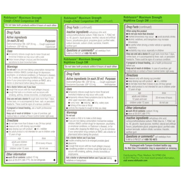 - Two 4 fluid ounce bottles of Robitussin Maximum Strength Cough + Chest Congestion DM and Maximum Strength Nighttime Cough DM, Cough Medicine