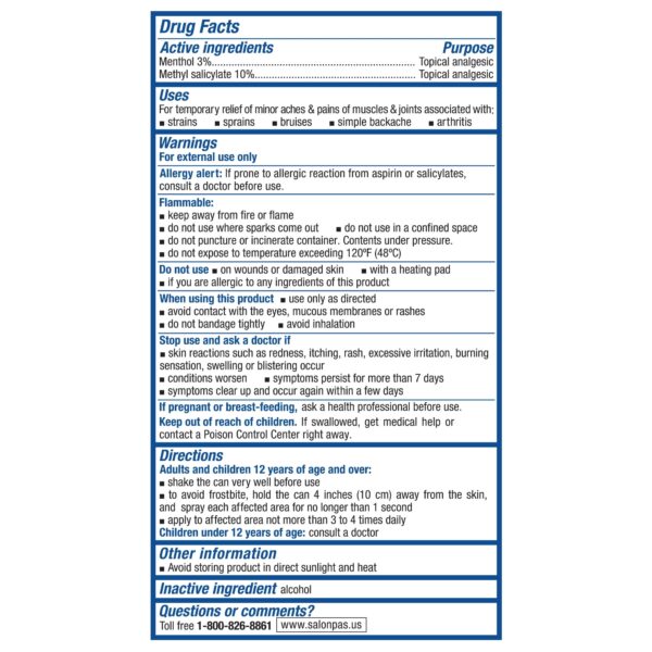 - FREEZE PAIN FAST: Convenient, effective pain relief for your on-the-go lifestyle for adults and teenagers! Salonpas pain relieving spray is fast drying & feels like an icy spray as menthol provides a soothing sensation & methyl salicylate keeps pain at bay for up to 8 hours.