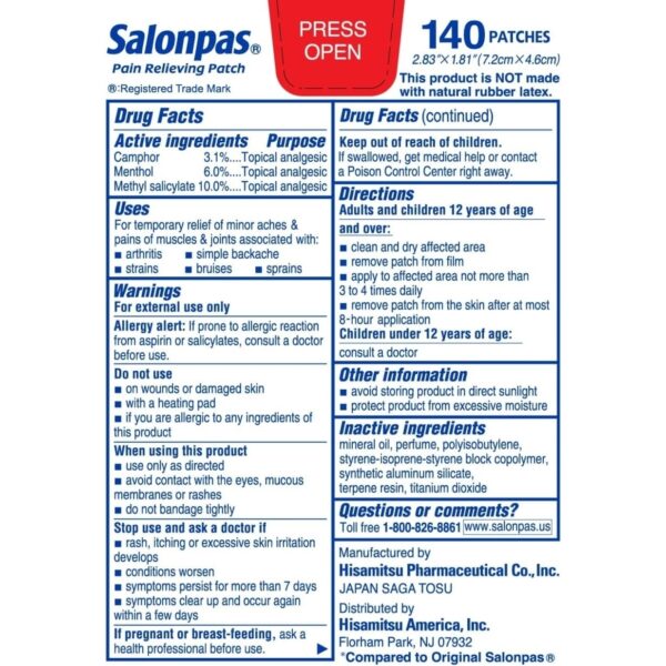 Salonpas Pain Relieving Patch 140 Patches These comfortable, effective topical pain patches have 3 powerful pain fighters that work at the site of pain. Whether for your back, shoulders, neck or legs, Salonpas Pain Relieving Patches can provide hours of relief. With rounded corners and flexible fabric, application is easy and the patches bend with your movements. The patches stay where you need them and are easy to remove.