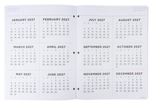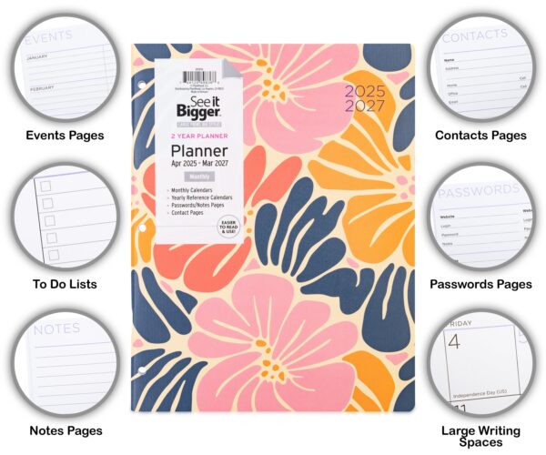The See it Bigger dated planner covers 24 months from April 2025 to March 2027. It features holiday listings and yearly referenced calendar. A dedicated Note, Contact, and Password Record pages to keep important info at your fingertips! One month per two page spread format with abundant space. Sturdy cover for maximum protection. Made of premium thick paper to reduce bleeding through or ghosting.
