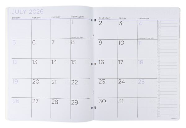 - Resources include a list of holidays, reference calendars, contacts pages, to-do list columns, passwords, events and extra notes pages to accommodate your scheduling requirements