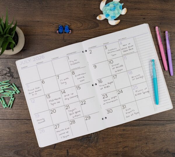 The planner arrived in new condition, April 2025 to March 2027. It’s 8½ inches wide and 11 inches tall, the cover is sturdy and has bright colors, and it’s thin enough to put in a big purse. There are pages for personal information, medical and other contacts, holidays, yearly calendars, events. In the back there are pages for notes, address “book” and passwords.