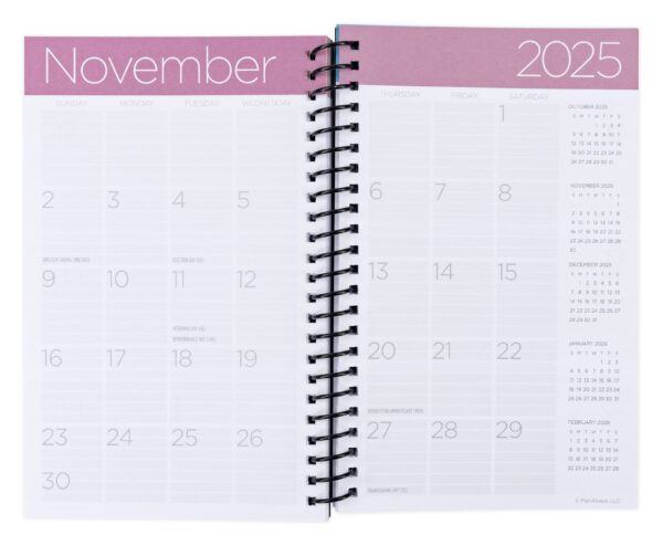 See it Bigger monthly weekly dated planner covers 15 months from April 2025 to June 2026, featuring monthly and weekly dated pages. A defined space along the right margin provides room for notes and tasks. Weekly view pages so each week may be viewed in its entirety. Monthly view pages show Yearly Reference Calendars and Holiday Listings making future planning simple. A dedicated Note, Contact, and Password Record Pages for easy retrieval.
