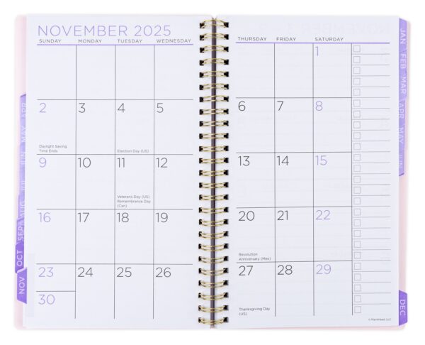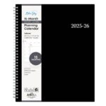 The See it Bigger planner covers 15 months from April 2025 to June 2026, featuring monthly and weekly dated pages. Laminated monthly tabs allow for quick access to separate monthly calendars that open flat in side-by-side pages. A defined space along the right margin provides room for notes and tasks. Weekly view pages so each week may be viewed in its entirety. Monthly view pages show Yearly Reference Calendars and Holiday Listings making future planning simple. A dedicated Note, Contact, and Password Record Pages for easy retrieval.