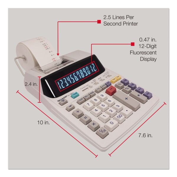 Balance the books every month with help from this Sharp EL-1801V printing calculator, which features cost, sell, and margin keys that are ideal for business applications.Create a record of your calculations with this Sharp printing calculator. The red and black printer ribbon lets you clearly denote positive and negative figures, while the raised spool makes it easy to review numbers as you work. The large, responsive buttons are color-coded for easy identification of numbers, functions, and specialty options. Use the various decimal settings to select the right option for your accounting tasks, and choose between grand total and rate setting mode for customized printouts. With a traditional numeric keypad setup, this Sharp printing calculator allows for fast data entry. Printing calculator offers 12-digit blue fluorescent display for convenient viewing. Prints up to 2.0 lines per second in two colors on standard size paper roll. Dimensions: 2.5″H x 7.6″W x 10.1″D. Powered by any standard AC outlet, eliminating the need for expensive batteries. 4-key memory keeps often-used figures accessible for speedier calculations. Tax calculation, cost, sell, margin, mark-up, and item counter functions make financial calculations streamlined. Decimal switch, rounding switch, average, percent, constant calculation, double zero, grand total, and shift functions to solve many additional mathematical problems. Package content: AC adapter, paper roll, 1 x CR2032 battery. Prints positive numbers in black and negative numbers in red, eliminating misreads. Angled display is easy on the eyes. 6-month manufacturer limited warranty.One-Touch CalculationsRound off numbers with decimals, add or subtract tax, and find averages of many amounts with the function buttons offered on the Sharp EL-1801V Calculator. Use the grand total key to bring together multiple figures in a complex math equation, or track profitability with the cost/sell/margins function. Easy to Use, Time and AgainThe…