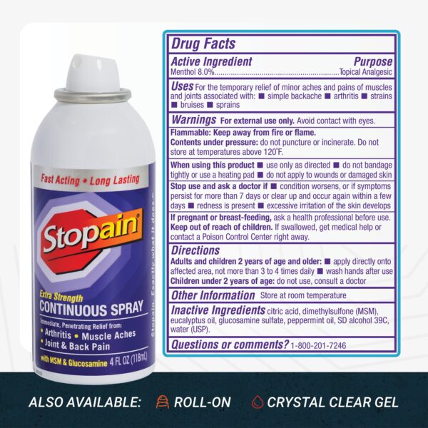 Stopain Pain Relief Spray 4oz (2 Pack) USA Made, Max Strength Fast Acting With MSM, Glucosamine, Menthol For Arthritis, Lower Back Sciatica, Knee, Neck, HSA FSA Approved Topical Analgesic Products
