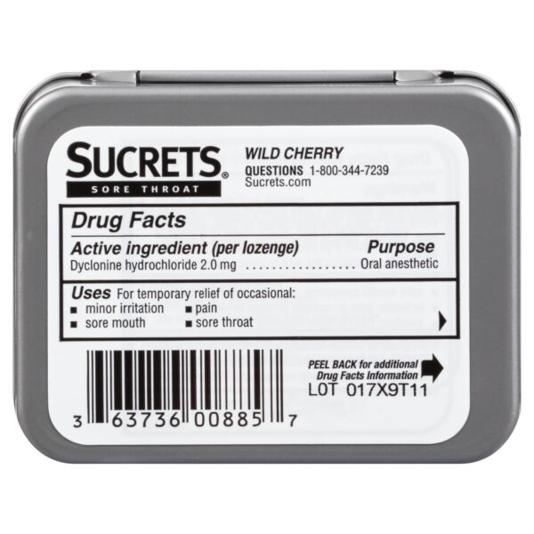 A classic sore throat remedy trusted by doctors and families for generations, Sucrets Wild Cherry Sore Throat Lozenges temporarily relieve occasional minor irritation, pain, sore throat and sore mouth. The lozenges contain dyclonine hydrochloride to provide sore mouth and throat relief. Allow the lozenge to slowly dissolve in the mouth and may be repeated every 2 hours as needed or as directed by a dentist or a doctor. Recommended for use in adults and children 4 years and older. Sucrets Lozenges come in a convenient, portable tin for fast-acting relief at home and on-the-go.