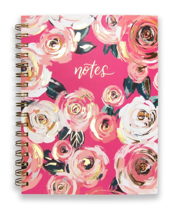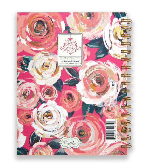 Class Act Stationery 3-Subject Spiral Notebook (9″x7″). 120 lined sheets. “Sweet Surprise” design collection by Pink Light Design has durable covers with gold foil and a gold twin-wire spiral. Sturdy poly dividers with tabs are secured within the pages to create three separate sections. This beautiful notebook fits easily into most bags and purses. Attractive addition to compliment your home or office. Perfect for notes, to-do lists, personal diary, and more.
