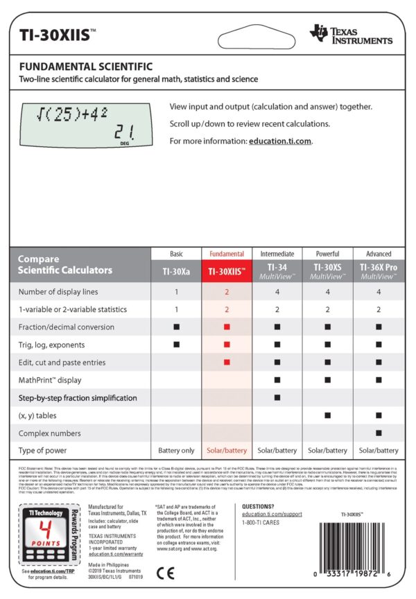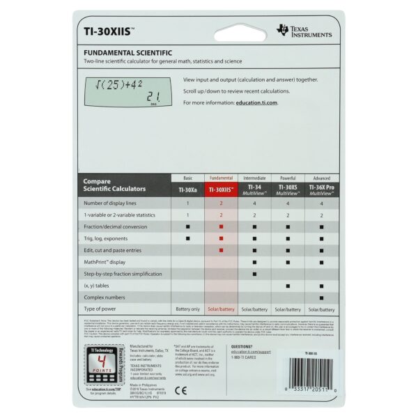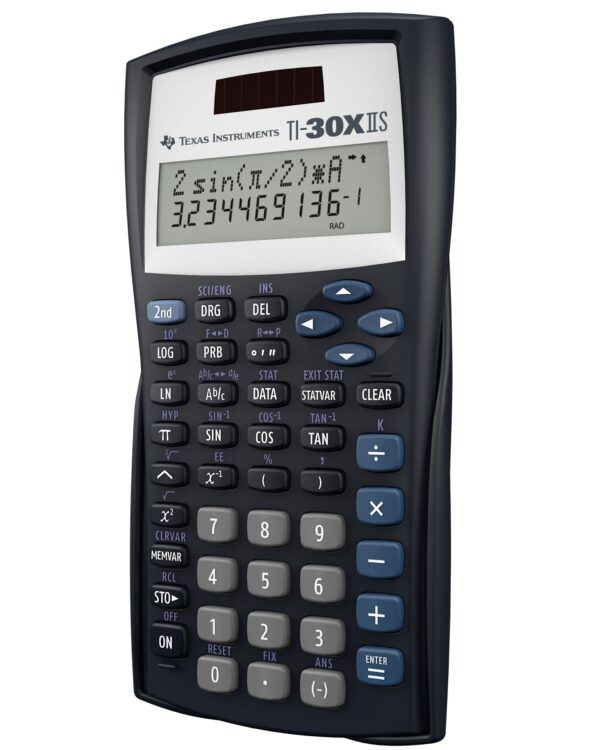 The TI-30XIIS™ is a fundamental, two-line calculator that combines statistics and advanced scientific functions for high school math and science. The two-line display shows the entry and calculated result simultaneously for easy understanding of the calculation. In addition, the TI-30XIIS™ scientific calculator is approved for use on SAT®, ACT® and AP® exams. The solar and battery-powered TI-30XIIS™ is Ideal for general math, pre-algebra, algebra I and II, geometry, statistics and general science.