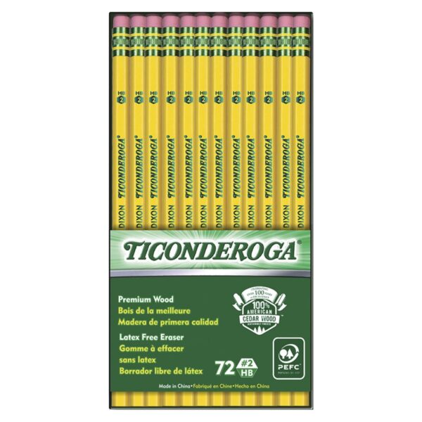 Ticonderoga has a tradition of fine quality writing instruments in the US for over 100 years. The exclusive graphite core features a proprietary formula focusing on graphite mined from carefully controlled sources to deliver extra smooth performance. Top-quality latex-free erasers remove marks completely without smudging. Premium wood harvested from responsibly managed sources provides smooth, even sharpening with minimal breakage. Teachers prefer Ticonderoga for its dependability and craftsmanship. When only the best will do, choose Ticonderoga brand pencils. Box of 72 pencils.