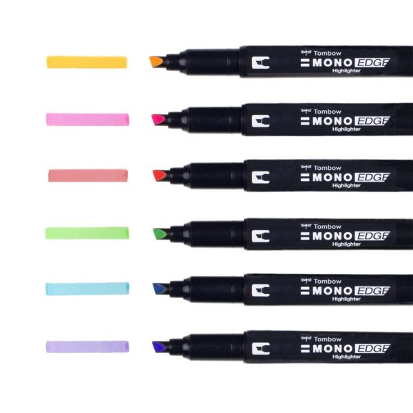Tombow Mono Edge Highlighters are perfect for highlighting, color-coding, and decorating planners, journals, notebooks, and study guides. Two tips, broad chisel and extra-fine bullet, with protective plastic sleeves. Use over pencil or ink. Fast-drying ink. Set of six colors. – Tombow Mono Edge Highlighters – Pkg of 6Mono Edge Highlighters, 6CT –