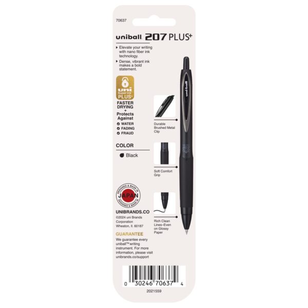 Take your writing to new heights with 207 Plus+ Retractable Gel Pens from uniball featuring a 0.5mm medium point with a stainless steel tip that resists bending and breaking. Advanced nano fiber gel ink produces an enhanced writing experience with exceptional smoothness, drying speed and line intensity, ensuring that every word is brilliantly communicated. Superior gel ink resists smudging and smearing, making these retractable gel pens ideal for everyday writing tasks, jotting down notes and signing all of your important documents. Medium point pens feature uni Super Ink PLUS+, entrapping the gel ink into the paper, producing fraud, fade and water-resistant documents that resist check washing or bleaching. The 0.5mm medium point produces rich, clean lines – even on glossy paper. Rubber grip gel pens provide an ergonomic hold that helps you complete long writing projects with greater comfort and precise control, while a translucent ink window indicates the level of gel ink remaining, so you don’t run out unexpectedly. Elevate your style with the sleek profile of the 207 Plus+ with modern metal accents and a designer metallic barrel.