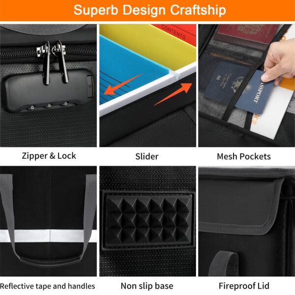 - : This fireproof file box is equipped with a combination lock for maximum document protection, a zipper closure reinforced with velcro for water resistance, and reflective tape for easy identification in low-light conditions or emergencies.