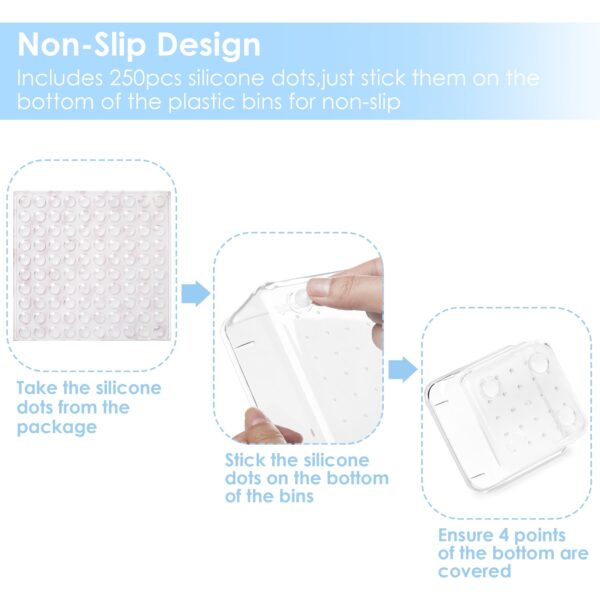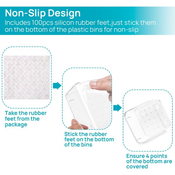 - Non-Slip and Durable — Extra 110pcs silicone pads are included, just stick them on the bottom of the plastic trays for non-slip. Made of durable and clear plastic, so you can see what’s in it without digging around or making a mess, help you get a neat lifestyle.