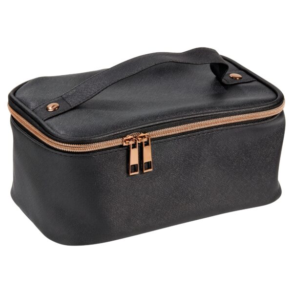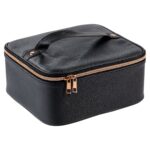 Keep your cosmetics and accessories organized and ready to go at a moment’s notice with this Black Cosmetic Train Case. This attractive case is the perfect traveling size and features a single two-way bronze zipper on a wide opening, an elastic strap to keep your brushes secure in the lid, and an easy-carry handle on top. The large, open interior space has enough room to keep all of your cosmetic and accessory items secure and in one place for travel, and the waterproof exterior fabric is durable enough to last. Great for on the go or storage at home, this train case has pockets to keep all of your accessories in one place for easy access. This sophisticated and elegant Black Cosmetic Train Case is the perfect traveling partner.