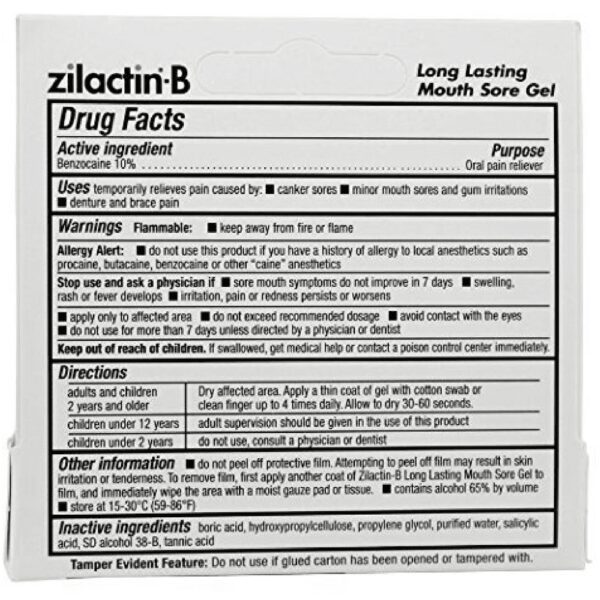 Eat or drink pain-free for up to six hours with Zilactin-B Canker Sore Gel. It works by forming a patent-protected bioadhesive film over the lesion to alleviate discomfort and promote healing. Made with 10 percent benzocaine, it is effective for canker sores, minor mouth sores, and gum irritations. This product can also relieve pain caused by denture and brace pain. Zilactin-B mouth sore gel is pharmacist-recommended and safe for ages 2 and up.
