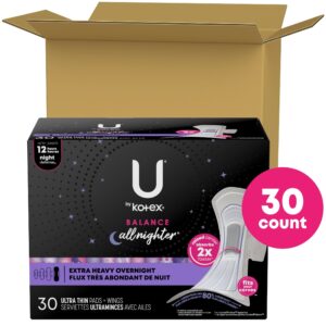 U by Kotex Balance Ultra Thin Overnight Pads with Wings, Extra Heavy Absorbency, 30 Count