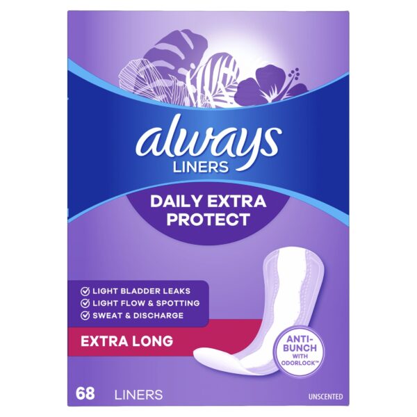 Looking for all-day freshness no matter how you move? Always Anti-Bunch Extra Protection Daily Liners Extra Long are designed to give you reliable protection with Anti-Bunch Technology. These feminine pantiliners are 5X drier than Always Thin and feature a dual layer design to quickly absorb and lock away leaks to keep you feeling clean for up to 10 hours. Plus, the Edge-2-Edge adhesive helps hold the liner in place. The Always Liners Fit sizing chart shows a range of liners for different shapes and needs so you can find your best fit. Get daily protection with Anti-Bunch Technology, so you feel fresh and clean, every day. 68 Liners, Light