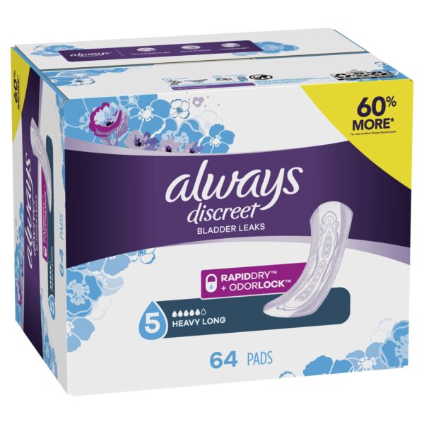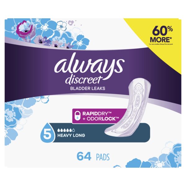 Always Discreet Incontinence Pads for Women, Heavy Absorbency, Long Length, 64 Count