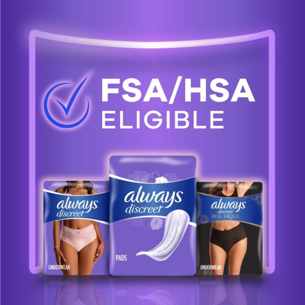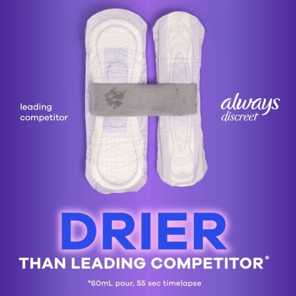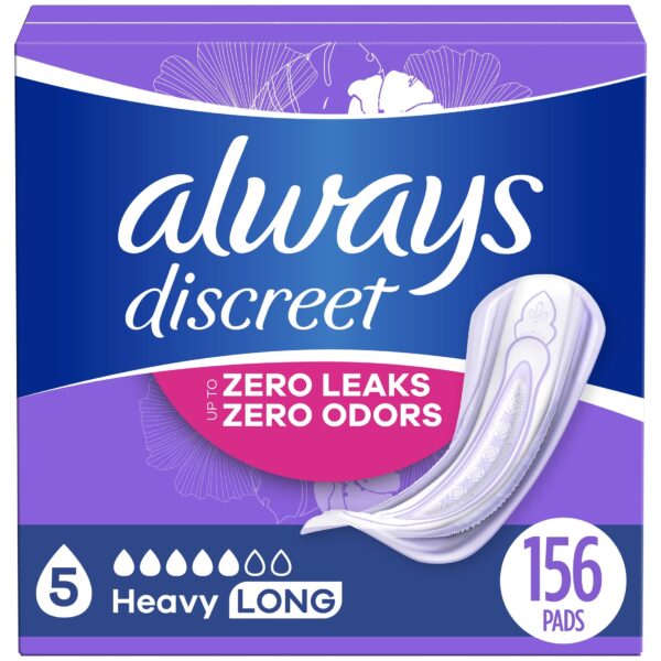 - Always Discreet Incontinence Pads – absorb 4X more than period sanitary pads of similar size