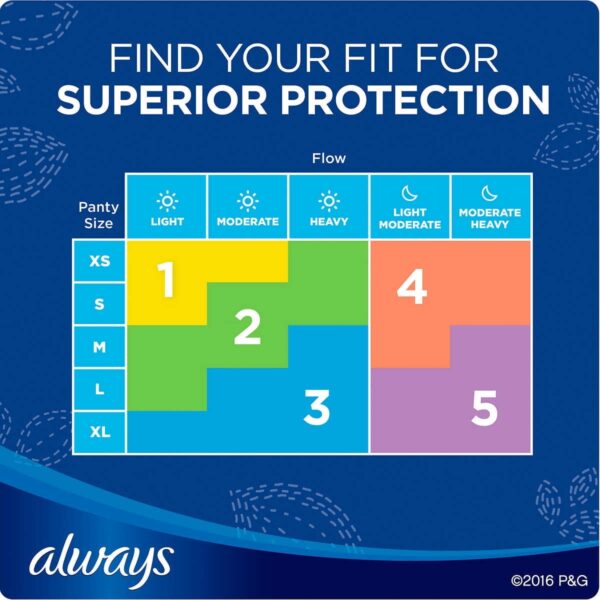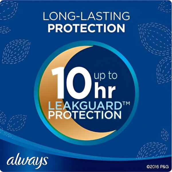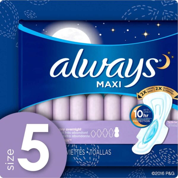 Product Description Sleep soundly through the night with the confidence that you’re fully protected. With a body-hug fit, Always® Maxi Overnight Pads pull fluid deep into the core and away from the edges for noticeably clean and dry protection. Designed with larger backs—up to 2X larger*—these pads let you sleep easy, knowing that you’re protected. For effortless protection that absorbs in seconds, trust Always Maxi Pads. *Vs. the Leading Regular Maxi pad. Up to 10 hours of protection so you can sleep uninterrupted Always® Maxi Pads with Wings are designed to stay in place and move with you Deep channels pull fluid into the core, away from edges, to help stop leaks Effortless protection that absorbs in seconds for superior comfort Features & Benefits Up to 10 hours of protection Always® Maxi Pads have a LeakGuard™ Core that protects for up to 10 hours, so you can sleep uninterrupted. Effortless comfort Don’t give it a second thought! Always Maxi Pads are so comfortable and secure that you won’t need to worry if you’re fully protected. Absorbs in seconds LeakGuard Technology with a RapidDry Core absorbs in seconds so you stay dry. Protects against leaks Deep all-around barriers ensure that leaks hardly stand a chance. Superior daytime protection Don’t let your period slow you down! Try Always Maxi Regular and Super Pads for up to 8 hours of superior period protection all day. FAQs What are the differences between day and overnight pads? Your body position and movements are different at night than they are during the day. Always® Overnight pads are designed with your different needs in mind. Designed with larger backs—up to 2X larger*—these pads let you sleep easy, knowing that you’re protected. Daytime pads are designed to fit and feel comfortable throughout the day. *Vs. the Leading Regular Maxi pad. What’s the difference between Always Ultra Thin and Always Maxi? Always Maxi Pads, in the blue package, provide the extra feeling of security many women get from using a thicker maxi pad. Always Ultra Thin pads, in the green package, are super thin and highly absorbent. How do I put on a pad? Always pads have adhesive strips to attach securely to your panties. Remove the paper backing and press the sticky side of the pad to your underwear. If your pad also has wings, remove the paper backing and wrap the wings around the underside of your panties. When should I change my pad? You’ll want to change your pad regularly to stay clean and comfortable, usually every 3–4 hours or more often if your flow is heavy. Remember to match the absorbency of the pad (Regular, Super, Overnight, or Extra Heavy Overnight) to your flow. Up to 10 Hours of Protection Effortless Comfort Absorbs in Seconds Protects Against Leaks Always Maxi Extra Heavy Overnight Pads with Flex-Wings, Unscented – Size 5 (54 ct.)