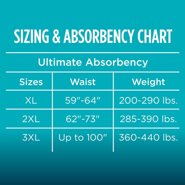 - Absorbency: sizes: XL, maximum absorbency: waist: 59″-64″, weight: 200-290 lbs.
