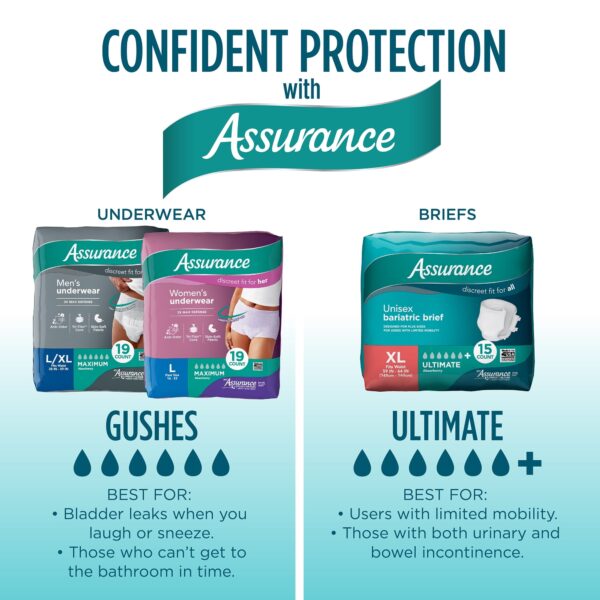 Maintain total confidence as you go about your day with these Assurance Incontinence Briefs Unisex. They are made with a soft and breathable cloth-like fabric on the outside for complete comfort. These Assurance briefs are made with an advanced core and a color indicator to show when they need to be changed. Each one has fasteners that grab anywhere on the cloth material for a snug fit. This maximum absorbency underwear comes in a pack of 4, each of which contains a count of 15, for your convenience. With a full range of products, Assurance lets you feel comfortable and dry while living your active, on-the-go lifestyle.