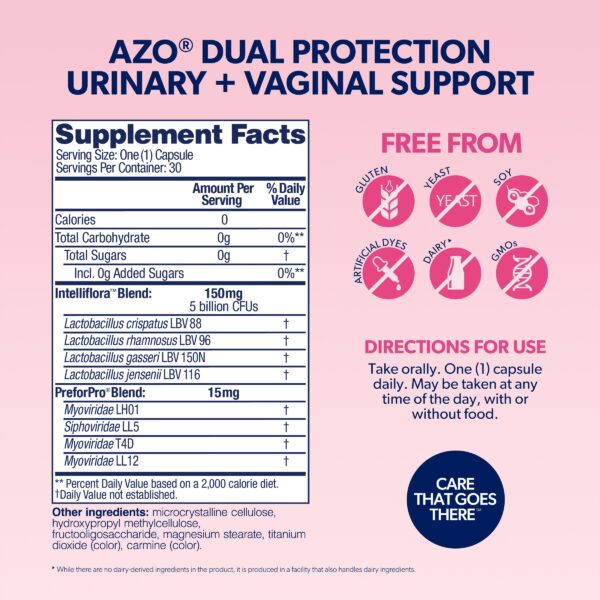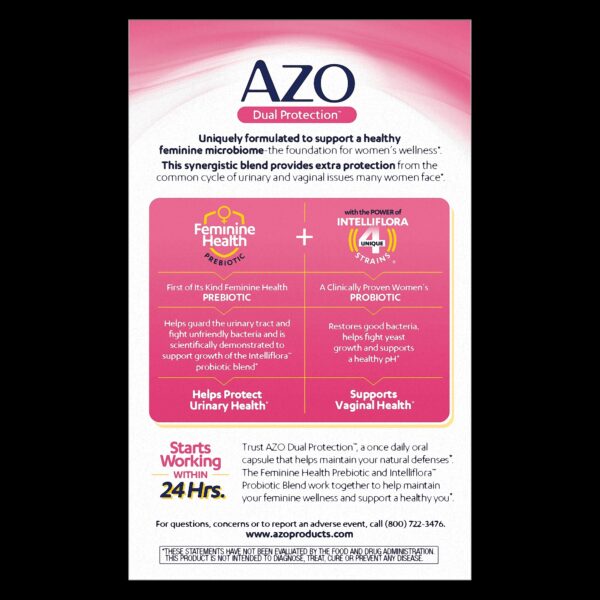 - AZO DUAL PROTECTION (URINARY + VAGINAL) 30 count. This once daily oral capsule works naturally to guard the urinary tract and balance the feminine microbiome, providing extra protection from the common cycle of urinary and vaginal issues many women face.*