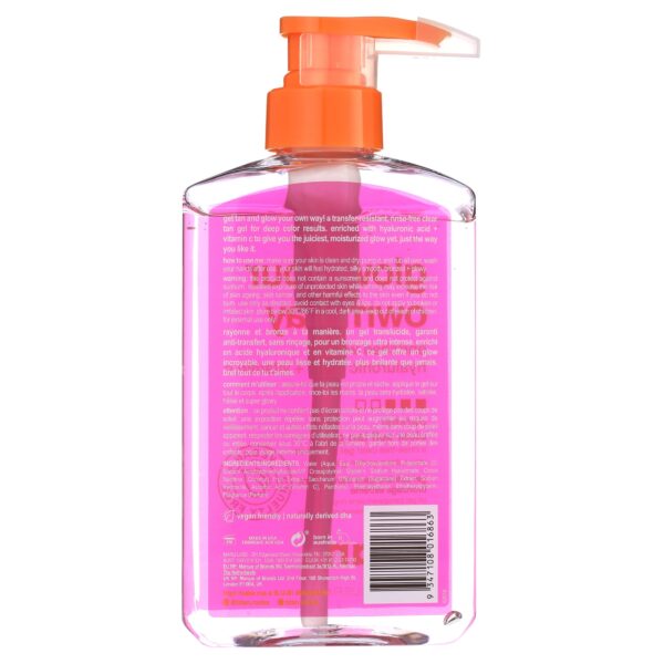this clear, dark self tan gel is for the babes who wanna glow their own way. enriched with skincare faves hyaluronic acid + vitamin c, this self tan gel is a skincare + tan combo made in heaven for hydrated, juicy, bronzed skin. the silky smooth gel formula glides on like a dream, blends seamlessly & absorbs fast AF so you can get glowin’ without the tacky tan development time. better yet, the clear, transfer-resistant, rinse-free gel means your glow will get glowin’ and you can get on your way.