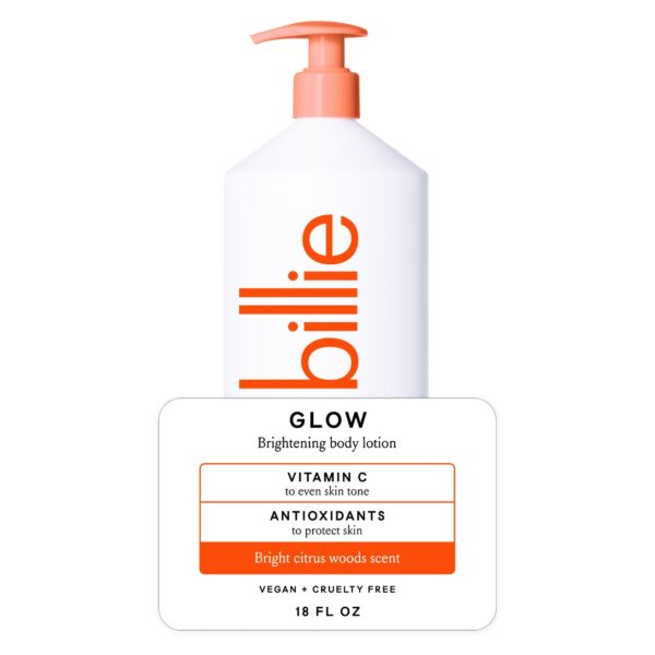 - Billie Glow Brightening Women’s Body Lotion, Citrus Woods Scent, With Vitamin C, 18 fl oz