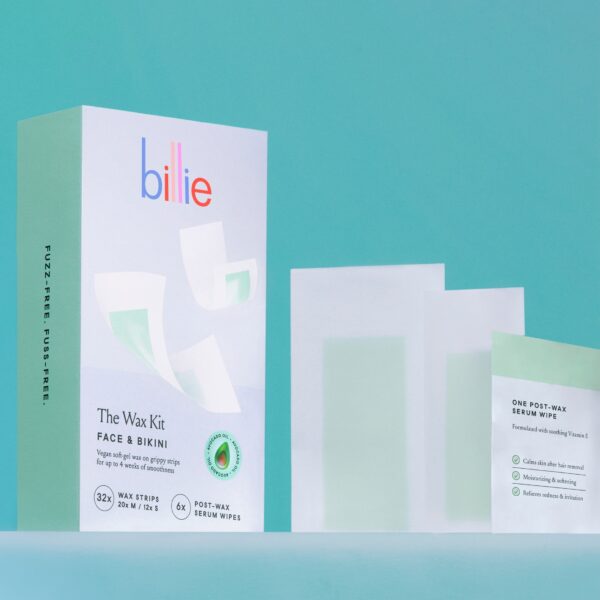 - Billie Waxing Kit, Face & Bikini Hair Removal Wax Strips, 32 Wax Strips, 6 Post-Wax Serum Wipes