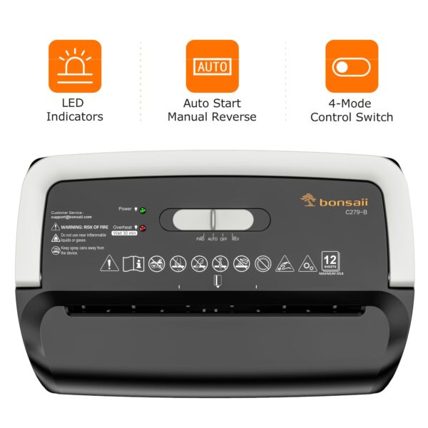 Esthetic wise it’s black and sleek with a nice size shred container. The container surprise me as to how tall it was, because that is what I needed. I like that it is not loud while shredding the papers. Sleek and slim alouds the bonsaii shredder to fot in small places. Also, on the front of the shred container is a widow so that you see how high the shredded paper is. The controls are: Forward, Auto, Off, and Reverse, and an Overheat light instructing you to wait 30 mins. before using again. I really like this Bonsaii Shredder. This is my review, I hope you enjoyed it!