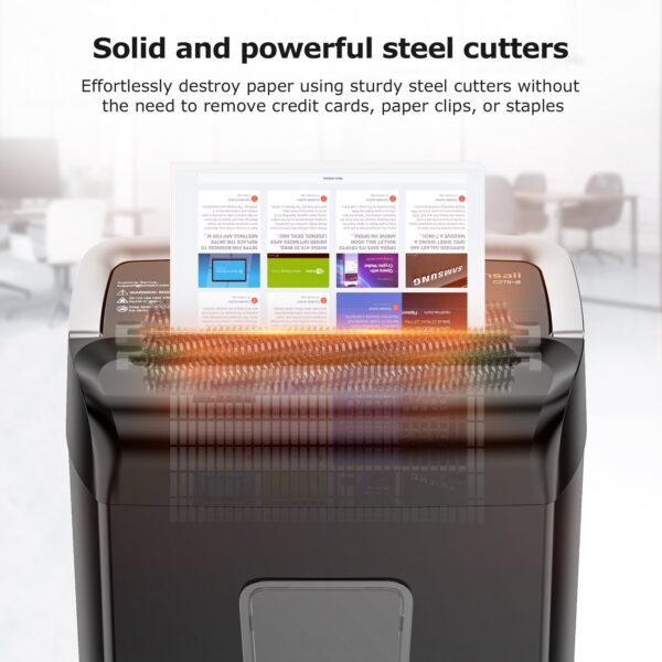 - 12-Sheet Capacity:The crosscut shredder can shred up to 12 sheets per pass into tiny particles measuring 13/64″ x 25/32″ and is capable of shredding staples, paper clips, credit cards, and mail. With a P-4 security level, it ensures the safety of your confidential information.