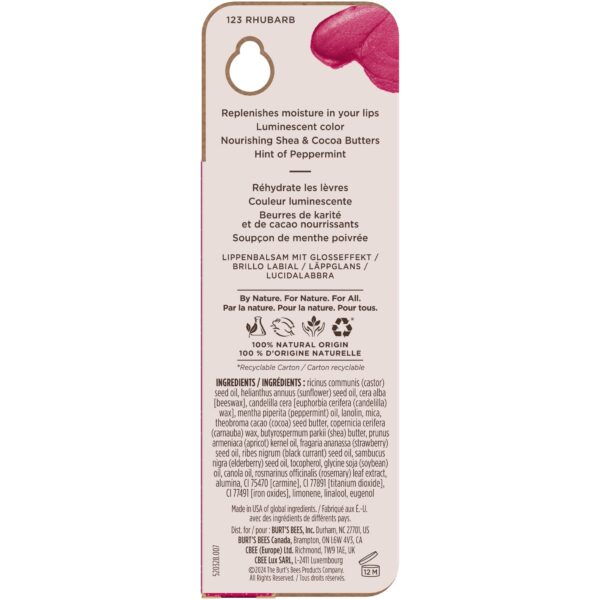 - VIBRANT RHUBARB COLOR: The flattering, luminescent shade of Burts Bees Lip Shimmer Rhubarb adds shine and enriches lip color with a bright, reddish pink hue
