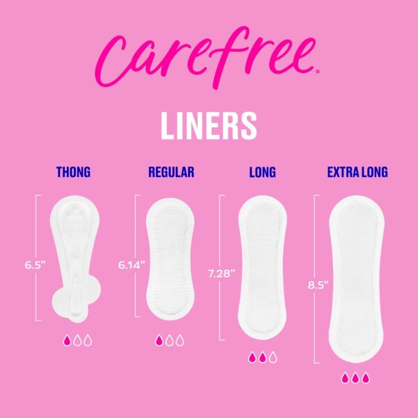- FIND YOUR FIT – Carefree panty liners are available in different lengths and absorbencies for your unique needs: thong liners, thin liners, regular liners, long liners and extra long liners.
