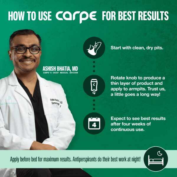 - EASY TO USE ANTIPERSPIRANT DEODORANT: With a thin layer of Carpe Antiperspirant Lotion you can reduce sweat with safe and effective ingredients. Apply our sweat control deodorant before bed for best results and say goodbye to your armpit sweat and smelly underarms without the downsides of prescription oral treatments, Botox injections, or iontophoresis.