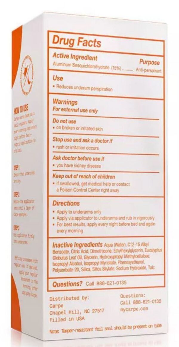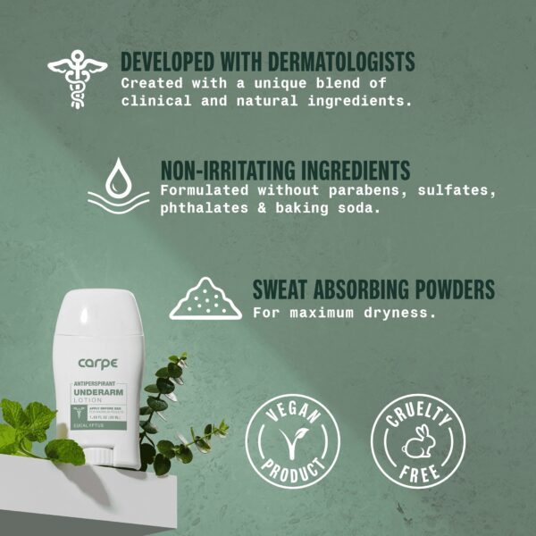 - DEVELOPED WITH DERMATOLOGISTS: Carpe’s scientifically developed sweat control formula has been independently tested for safety and proven to be a leading over-the-counter sweat solution. Our deodorant for extreme sweating is gentle on skin & provides the protection you can count on!