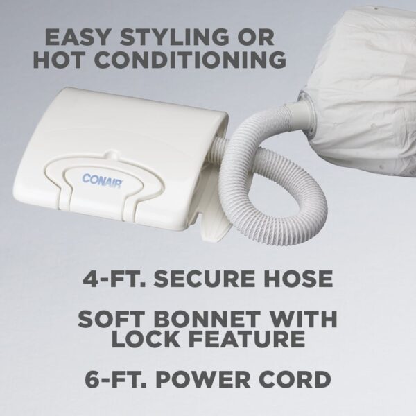 This product was incredibly cheaply made. The bonnet would not stay attached to the hose. The hose material was pretty thin – so I’m thinking it will have a short lifespan, nor was I impressed with the plastic material that made up the bonnet. I returned this product to Wal-Mart right away without hesitation. I ended up buying a Carel Soft Bonnet Dryer elsewhere. It is more expensive – but much, much better. I recommend the Carel – and say avoid the Conair model at all costs.