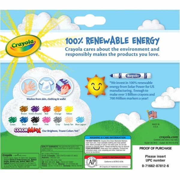 div classaplus h5div idheader0/div/h5 div idtext0 classa-spacing-smallpCrayola Classic Broad Line Washable Markers are all-purpose washable markers specially formulated to wash clean from skin clothing and walls. This pack contains 12 markers in an assortment of vibrant hues each with a broad tip for drawing doodling writing labeling and more. They contain recycled plastic which gives a second life to over 1 million pounds of plastic. Crayola Classic Broad Line Washable Markers are designed for