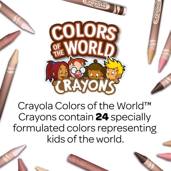 - COLORS OF THE WORLD: Make coloring pages and drawings even more realistic with Crayola Colors of the World Crayons. These skin tone crayons include colors like Deepest Almond, Medium Golden, and Light Rose.